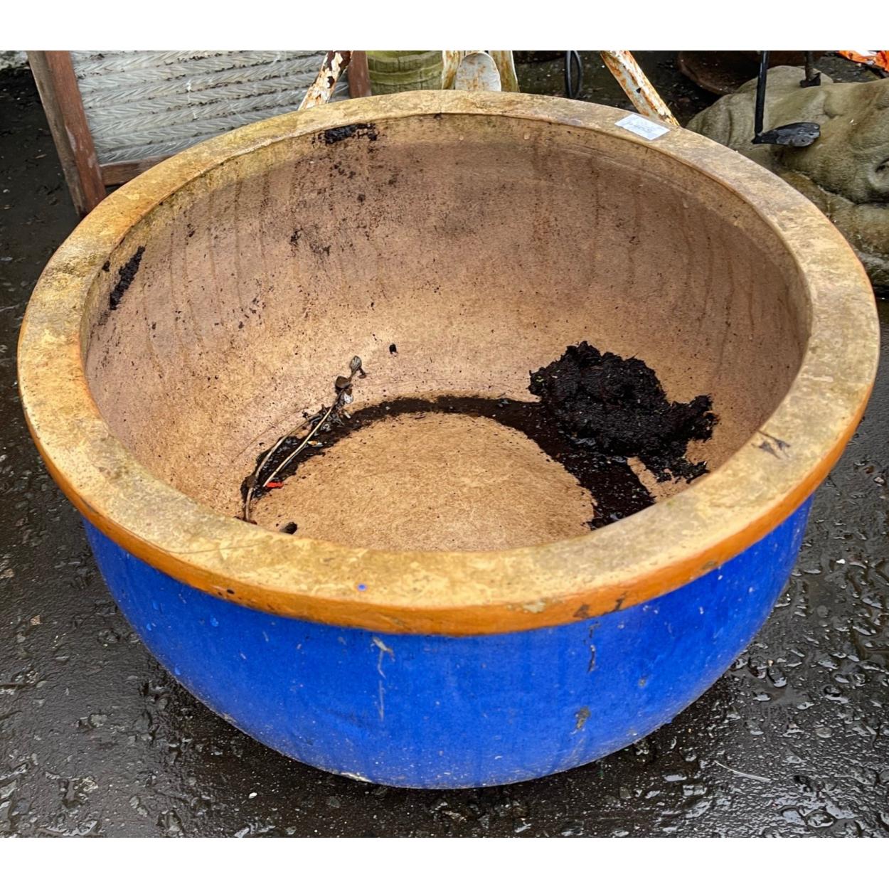 A VERY LARGE blue glazed ceramic garden planter - dimensions 11" height x 21" diameter approx - cost new £90 plus!