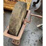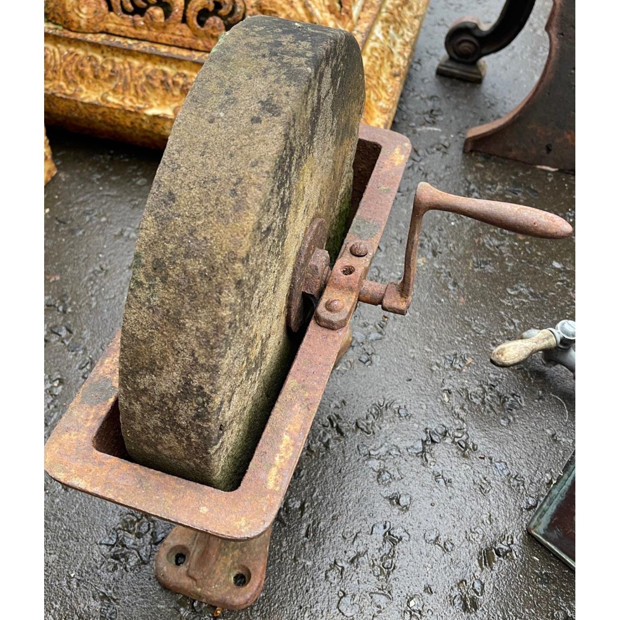 An antique white sandstone hand-operated knife grinder, wheel diameter 14" approx. Would make a fabulous garden feature.