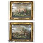 A Pair of Victorian style English School oil paintings within SUBSTANTIAL gilt stucco frames - a trio of hunting dogs within a country setting, the other painting depicting two young girls climbing over a garden wall - no artist shown - dimensions both 67cm x 57cm approx