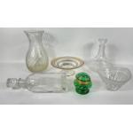 A box of glassware to include a small boat-shaped crystal bowl (18x10cm), 2 decanters, one with no stopper, a glass tazza 21cm dia decorated with a gold trim (2 small chips on rim), 1 large flower vase 27cm tall, a small metal-hinged bowl in green with white painted design stands approx 12cm tall