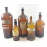 Five vintage brown APOTHECARY large bottles to include with POISON in raised letters on the glass first bottle (30cm) labelled TINCT CHLOROFORMI ET MORPH. PB 1885 (label on back of bottle dated 1947), bottle 2 (26cm), with partial label LIQ. PLUMBI SUBACET. ... third bottle (38cm) from Stockton on Tees labelled LIN. ACONITE. OLEAS... For External Use Only, fourth bottle (35cm) from Leeds labelled FERROTONE A Pleasing Palatable Tonic..., fifth bottle 16oz. from Runcorn EVANS Colloidal Solution IODINE