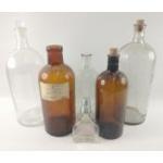 Five APOTHECARY bottles to include 2 clear glass with no labels (36cm high), one clear glass no labels, no stopper (25cm), one brown bottle (29cm, no stopper), from Liverpool labelled COMPRESSED TABLETS, one brown bottle no labels (29cm) plus a vintage CUSENIER liqueur bottle with aluminium drinking cap