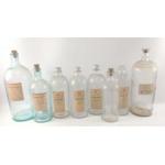 Four (one minus lid), bottles from Liverpool (27cm) with ACACIA GUM labels, two bottles (35cm and 27cm) from Leeds labelled EUPHRASINE (eye lotion), one bottle (34cm) with a TW Salmon & Son Ltd label along with a recipe for a chemical cocktail, and one bottle (26cm) with no labels