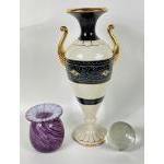A mixed lot to include a WORLD glass GLOBE paperweight 8cm diameter, a nice ALUM BAY purple shaded quality glass medium sized vase 12cm height x 9cm, and a tall vase with golded handles and rim by ELLE 37cm tall x 7cm width approx