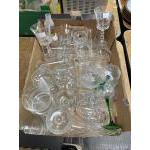 A box of mixed glassware to include a pair of GLEN GARIOCH whisky glasses, various wine glasses and champagne flutes, sundae dishes, plus vases some crystal.