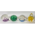 A SELKIRK GLASS pear-shaped paperweight with original paper label (11cm), a SELKIRK GLASS 'Gold Mist' 2003 paperweight with original paper label, a SELKIRK GLASS Christmas 1987 paperweight and a SCOTTISH BORDERS ART GLASS hand-crafted apple-shaped paperweight 7cm tall