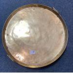 A SUBSTANTIAL vintage c1910 Indian solid brass twin-handled circular serving tray with copper rivets supported on four small brass supports - dimension 19" diameter