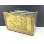 A brass magazine rack with aluminium interior in 2 sections with a repousse design of a sailing ship 42x23x29cm