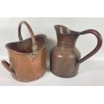 BEAUTIFULLY MADE! A small FRENCH ANTIQUE copper coal scuttle with castled seams - 22cm H x 22cm W and a large copper jug standing 28cm tall