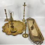 A quantity of QUALITY ANTIQUE(c1880's) INDIAN BRASSWARE to include candlesticks, a slimline jug a scalloped edged tray dimension 46cm diameter, a rather attractive rectangular nice quality serving tray 74cm approx and an ashtray etc