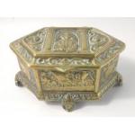 An antique six sided and lidded pink velvet lined REPOUSSE box depicting a rural manor house and a c17th century figure of a man (in style of Shakespeare) to include panels of coats of arms on raised feet - dimensions 12.5cm length x 7cm depth x 6cm height approx