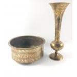 Two antique SOLID INDIAN BRASS items to include a very heavy etched brass pot 24cm diameter x 11cm height (suggestion; would make an ideal plant pot holder) with also a SUBSTANTIAL bulbuous brass etched tall vase - dimensions 34cm height x 12cm diameter approx