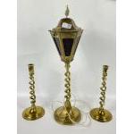 Three brass items comprising 2 candlesticks with twisted stems 30cm high plus a tablelamp with a street lamp style shade standing an impressive 59cm tall