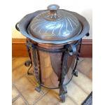 An ANTIQUE copper coal bin with a nice patterned lid, set within a wrought iron frame - really nice item - dimensions height 47cm x diameter 33cm