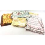 A pair of vintage lined curtains size 54x40" made from Sanderson's material, pale blue with a floral design also additional material for cushions etc, also a selection of retro 70s material - shades of orange and brown, a quantity of cream material with a pink flower pattern and also some vintage 1970s pillowcases
