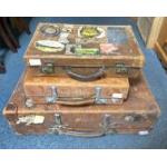 Three SUBSTANTIAL vintage leather suitcases - one large and two small hand luggage ones - large case dimensions 67cm length x 42cm width x 17cm depth - and the smaller case 41cm length x 28cm width x 12cm depth approx and the other smaller one 43cm length x 26cm width x 10cm depth approx, this smaller case has plenty of travel labels on it to include THe Savoy Hotel Madrid, Karlstad, Hotel Norge Bergen, Excelsior Palace Venise-Lido Hotel and many more!