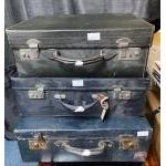 A set of three vintage suitcases, two in navy blue (one with DB initials) and one in black - largest case size 20” x 14” x 7” depth approx