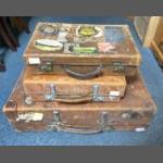 Three SUBSTANTIAL vintage leather suitcases - one large and two small hand luggage ones - large case dimensions 67cm length x 42cm width x 17cm depth - and the smaller case 41cm length x 28cm width x 12cm depth approx and the other smaller one 43cm length x 26cm width x 10cm depth approx, this smaller case has plenty of travel labels on it to include THe Savoy Hotel Madrid, Karlstad, Hotel Norge Bergen, Excelsior Palace Venise-Lido Hotel and many more!