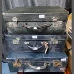A set of three vintage suitcases, two in navy blue (one with DB initials) and one in black - largest case size 20” x 14” x 7” depth approx