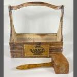 A vintage wooden TRUG suitable for the garden or for keeping cleaning items together 32x16x32cm plus a small wooden mallet 26cm tall