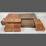 A collection of VINTAGE wooden boxes to include empty cutlery canteens and four boxes, each 12.5 x 12.5cm with fretwork tops (some damage to them) plus four very old tins