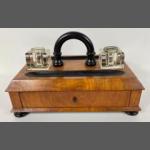 A good-sized wooden desk correspondence cabinet complete with drawer and 2 period glass inkwells (28x18x19cm)
