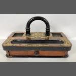 An antique wood and brass desk correspondence with drawer and space for 2 inkwells (25x15x6.5cm)