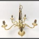 Three wood and brass ceiling light fittings each for 5 lights with 14 fluted glass light shades