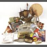 An INTERESTING mixed box to include 2 EPNS salvers with rust spots, a quantity of decorative copper items, a brass letter box with name, a vinaigrette, 6 shot glasses, small paperweight, 2 old sets of glasses, calculator, decorative Radio Times cover, a wooden ship, a brass dinner gong etc