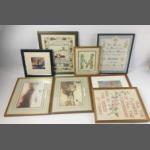 A box of assorted FRAMED needleworks and prints, 8 in total