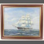 An attractive modern oil on canvas painting of a sailing ship in full sail on a benign sea. Rather well executed and bright and fresh in a nice sympathetic wooden frame. Measures 57 x 48cm approx.