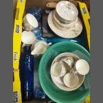 A mixed box to include a large green mixing bowl (33cm dia), an old-style supermarket pate dish, a print of a male torso (frame size 42x32cm), a mixed collection of blue glassware, a 6 person tea service by EMPIRE ware with milk jug, sugar bowl and sandwich plate, white with gilt design, some damage to cups and a copy of BARTOLOMEW'S GAZETEER of the British Isles 1887