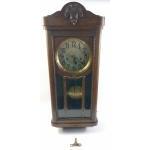 A wooden wall clock with loose pendulum spring and key. Minor issues to face. No makers mark apparent.