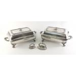 Two superb heavy gauge silver plated lidded warming servers. Ornate embossing and 'GANG WARILY' crest on one. 30cm x 20cm approx. Note handles are mis matched and do not fit. Great quality !