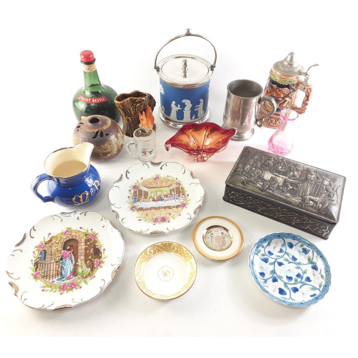 A mixed lot of good quality decorative items to include WEDGWOOD biscuit barrel, Beer Stein, small Caithness vase, tankard, art glass, art pottery, musical Danish bottle, Sylvac, Chokin plate etc.