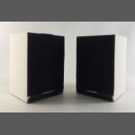 A pair of MORDAUNT-SHORT MS10 speakers. In good useable order with intact cones. 29cm tall. Overpainted in white and wear to grill covers.