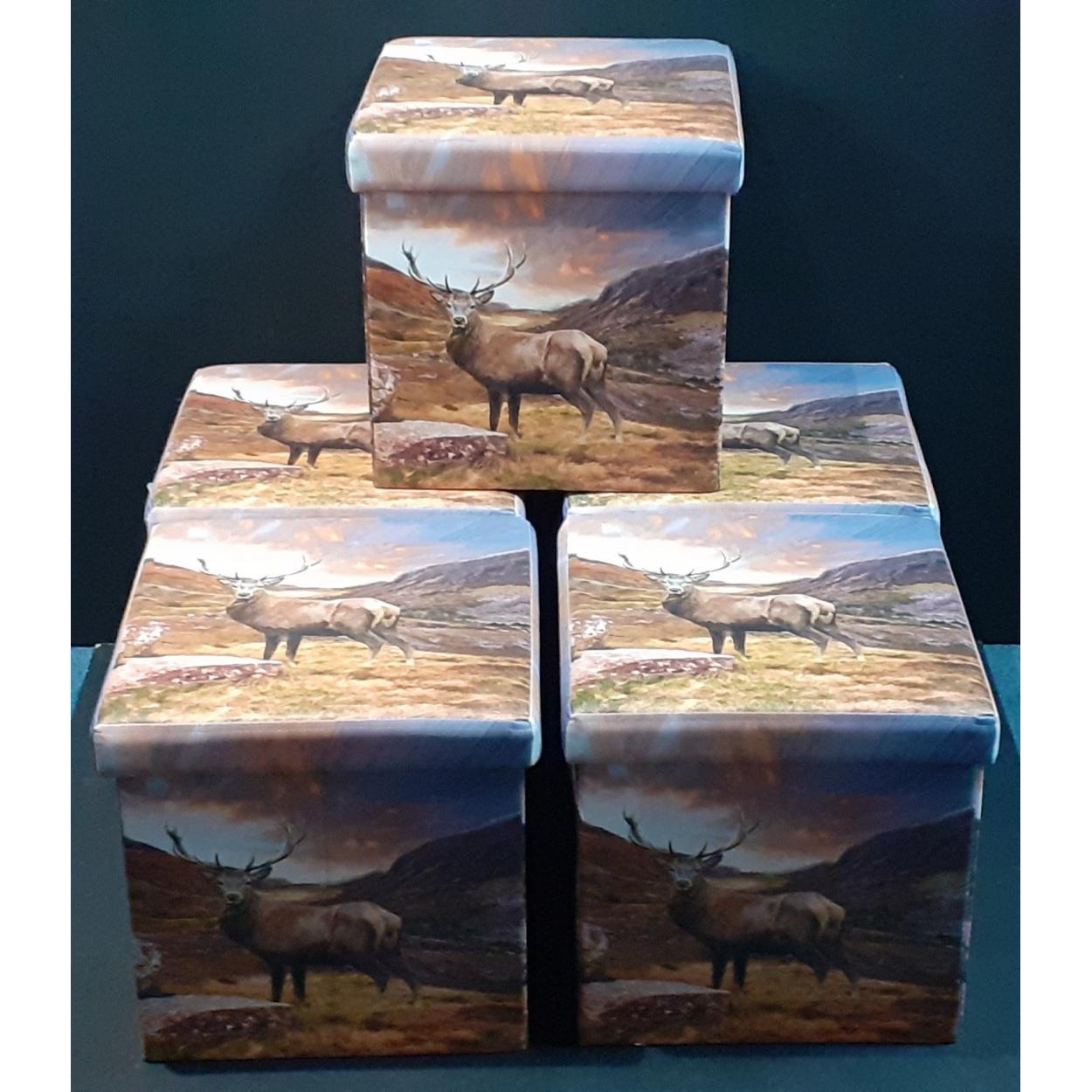 Five beautiful MONARCH OF THE GLEN folding lidded leatherette storage boxes. 38cm square. A few minor rubs from use but overall very stylish and useable.