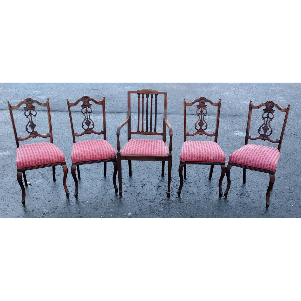 Four dining room chairs and a matching carver. Minor loss noted at the rear of one.