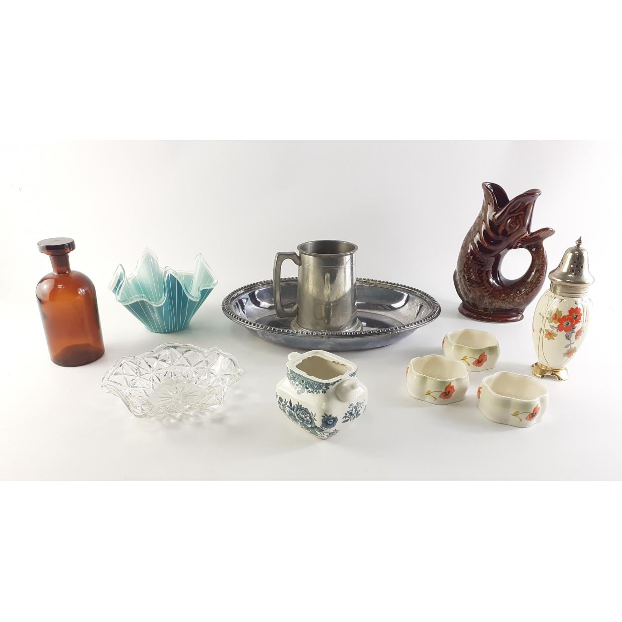 A small mixed lot of items of interest to include handkerchief dish, A fish Glug jug, ceramic shaker A/F, pewter tankard, three small Palisay ware Royal Worcester salts, milk jug, brown bottle and a large silver plated server.