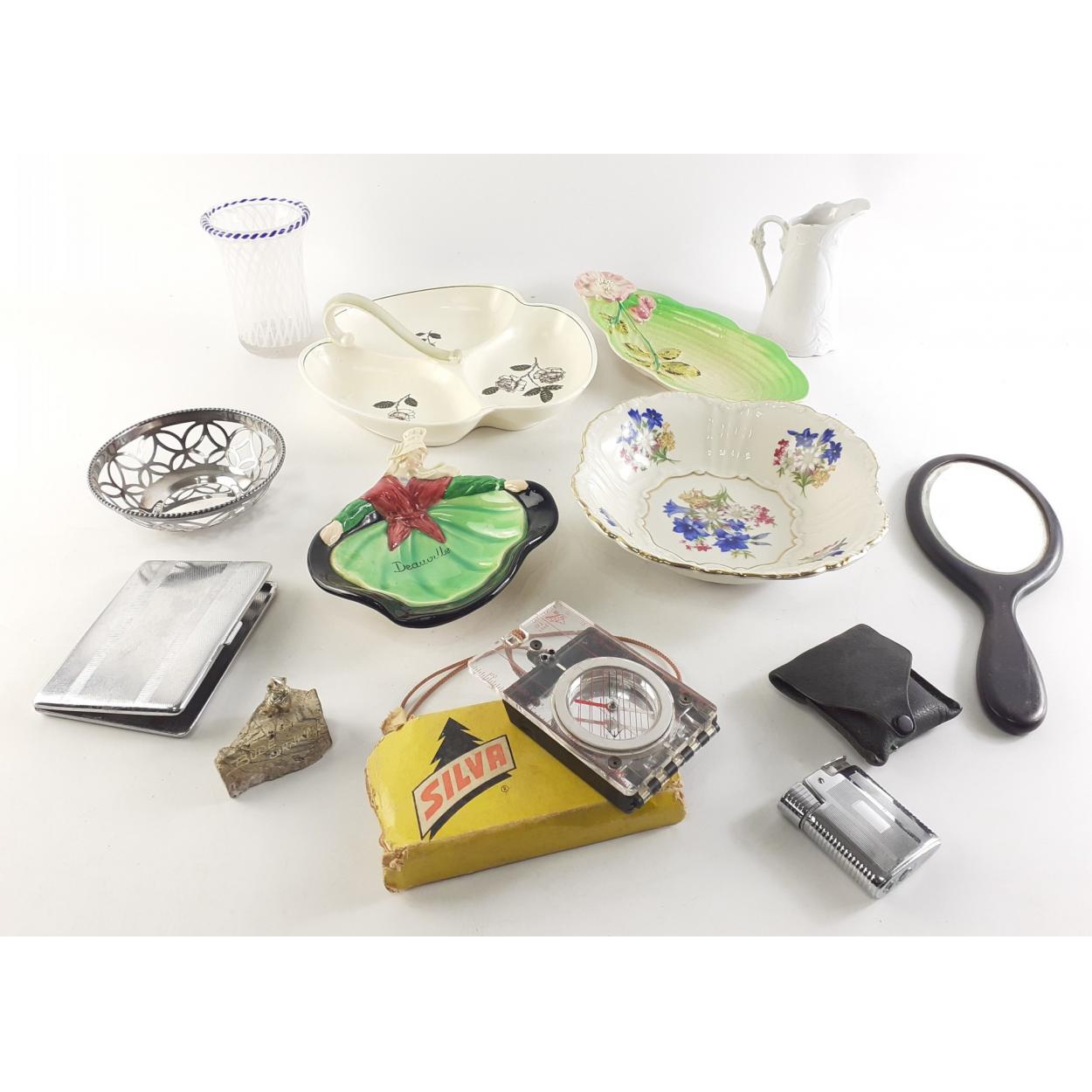 An interesting mixed lot of items of interest. Various ceramic plates. Wooden handled mirror, compass. A classic RONSON lighter and engine turned cigarette case.