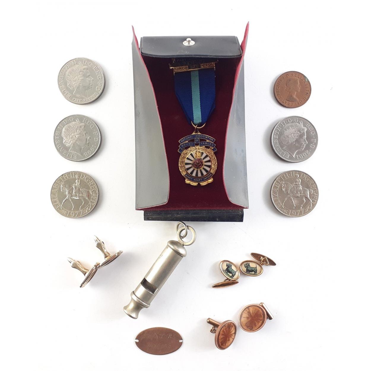 Cased Masonic Jewel, cufflinks, whistle and some Crowns