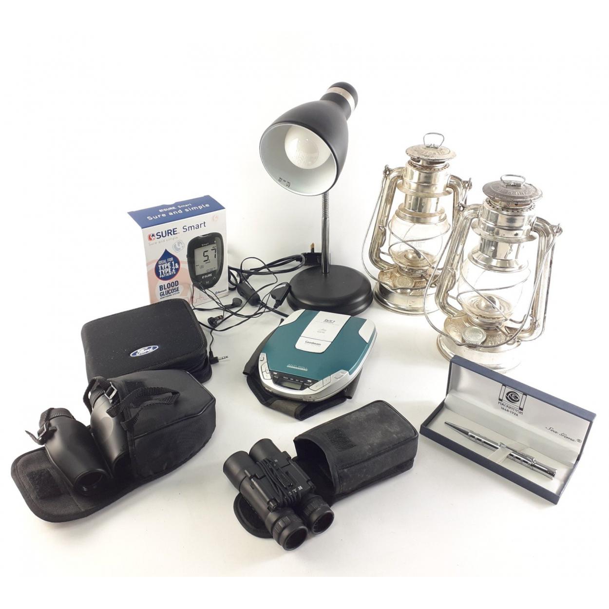 A mixed lot to include HALINA Binoculars, HELIOS binoculars, two West German lamps, modern desk lamp and Goodmans personal CD player.
