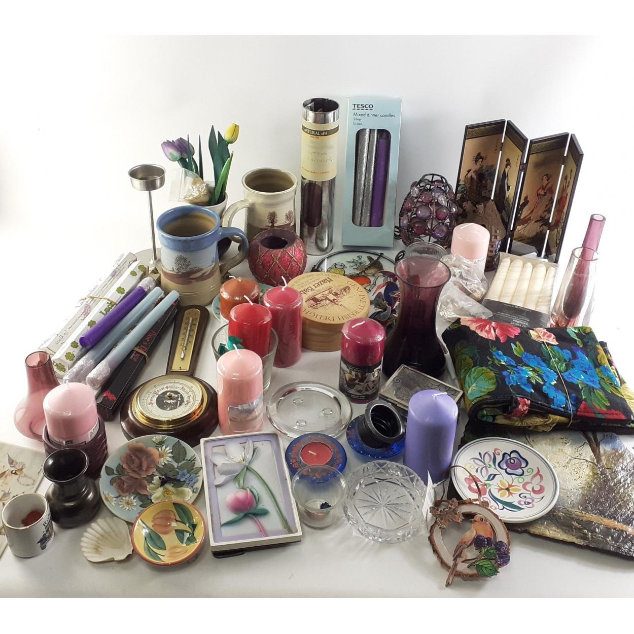 A collection of decorative items and many candles, polished stones, incense sticks and much else.