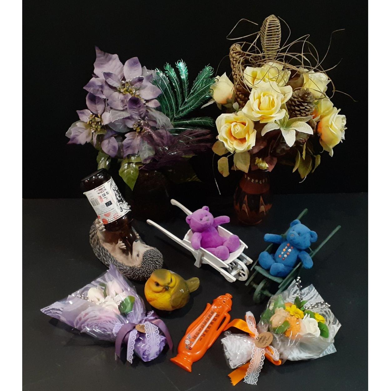 A mixed decorative lot, studio pottery, resin hedghog, Teddy Bear wheelbarrows and artificial flowers.