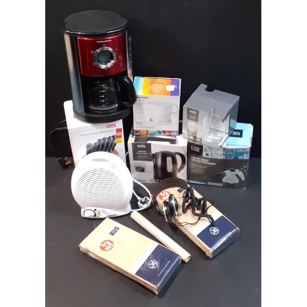 Mixed lot of kitchen ware and others. Super eight piece knife block, boxed kettle, boxed hand held steamer, fan heater, coffee maker, Salter kitchen weights, headphones, Matalan king size sheets etc.