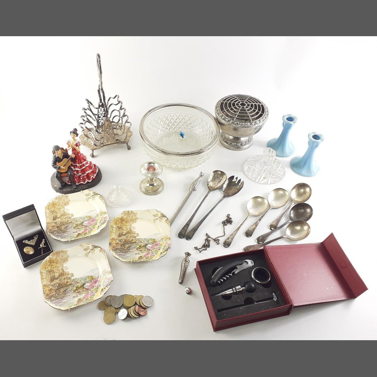 Mixed lot to include ceramics, silver plate, coins, ornaments etc.