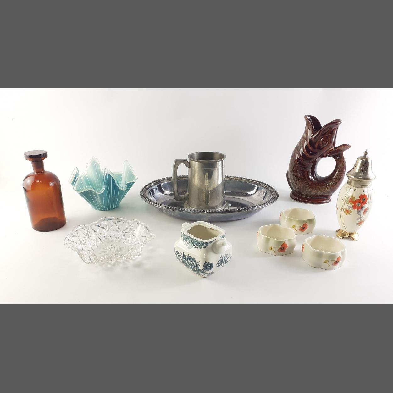 A small mixed lot of items of interest to include handkerchief dish, A fish Glug jug, ceramic shaker A/F, pewter tankard, three small Palisay ware Royal Worcester salts, milk jug, brown bottle and a large silver plated server.