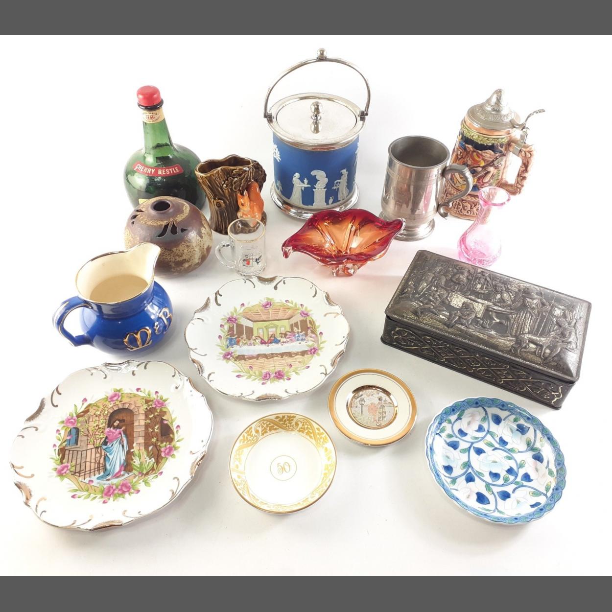 A mixed lot of good quality decorative items to include WEDGWOOD biscuit barrel, Beer Stein, small Caithness vase, tankard, art glass, art pottery, musical Danish bottle, Sylvac, Chokin plate etc.