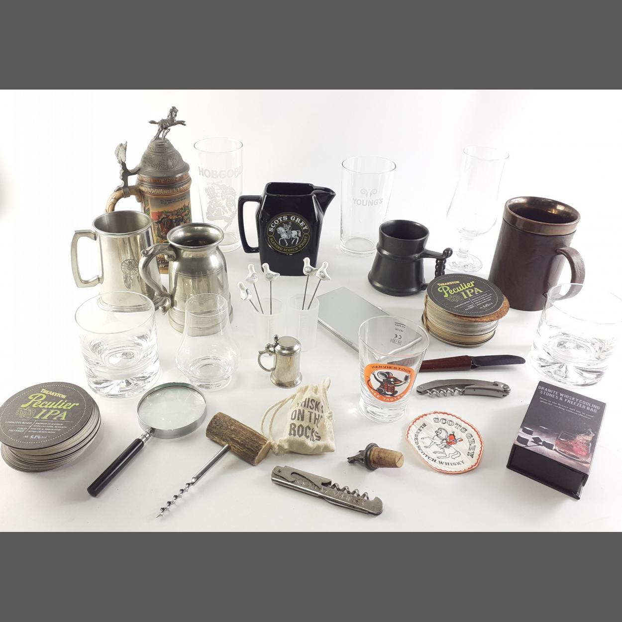 A good wee BREWERIANA mixed lot to include two lovely DARTINGTON GLASS large tumblers, steins, whisky memorabilia, corkscrews etc.