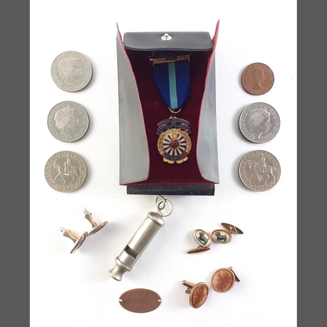 Cased Masonic Jewel, cufflinks, whistle and some Crowns